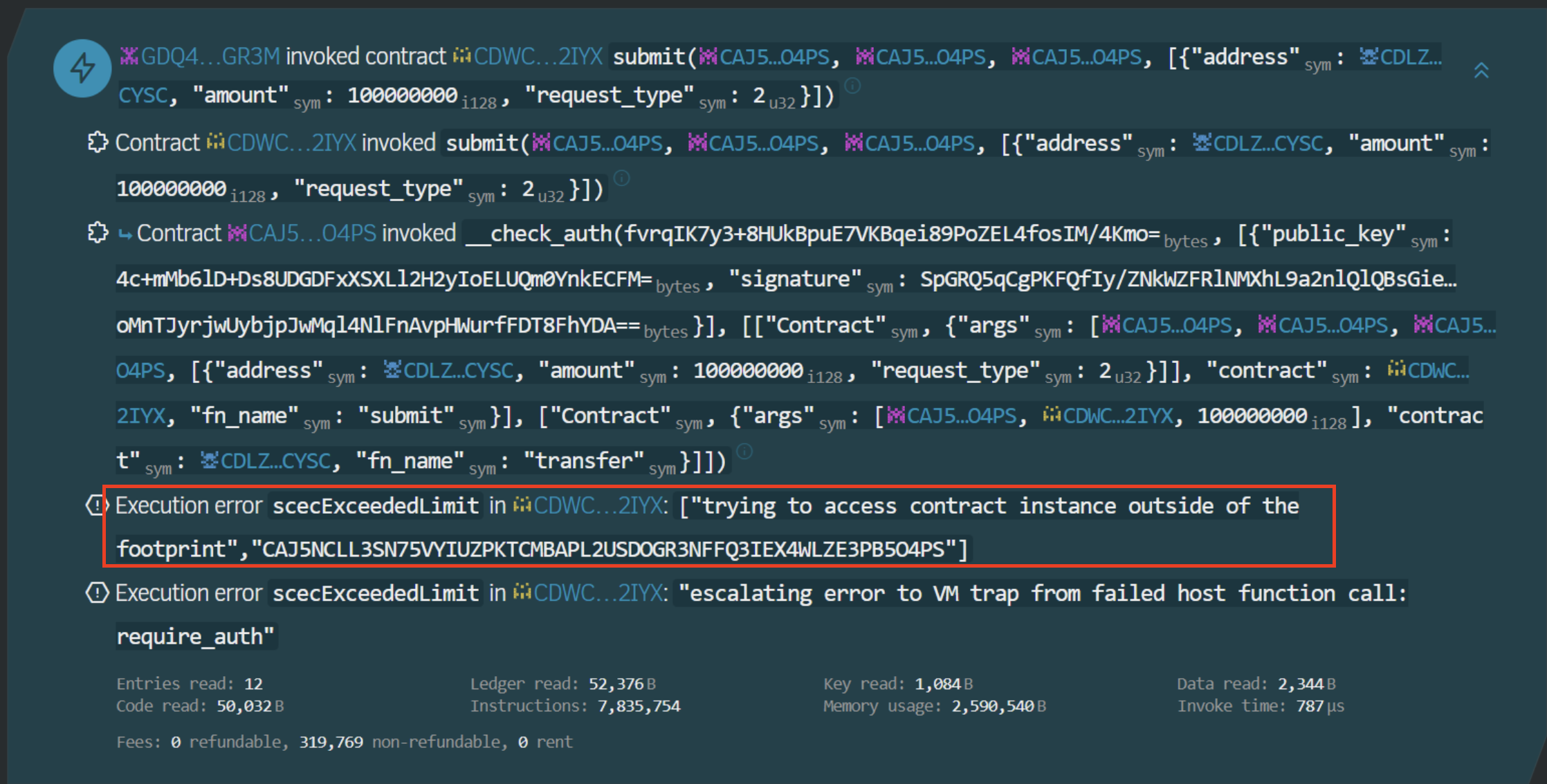 This step is crucial since generally we expect simulation to actually cover anything footprint-related but this isn't the case at the moment for smart accounts. If we ignore the fact that simulation doesn't account for the smart wallet since it wasn't directly invoked in the call stack this is what we end up with: