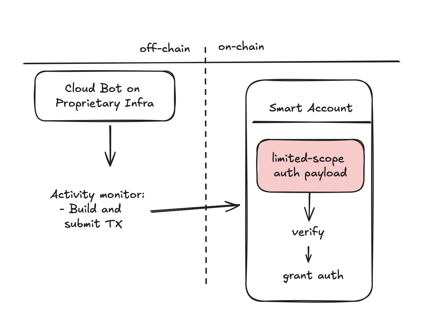 However, since we now know that smart accounts can define both custom authentication and authorization as well, we can use this to our advantage. What about a smart wallet that enables one signer to only perform a limited set of operation under a set of conditions? Thanks to smart accounts this is possible and can perfectly blend in a cloud on-chain actions executor: you give the deployed code your special limited signer's secret, and your on-chain logic decides whether the signer's signature is valid or not depending on the performed action.